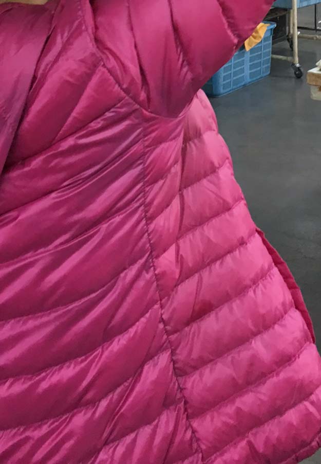 このダウンCはダウン一枚ですが、最高の品になると野生のグースダウン100%をキルティングしたものでキルティングをずらして2枚合わせにし、これに表に一枚、裏に一枚布を重ねて作られます。