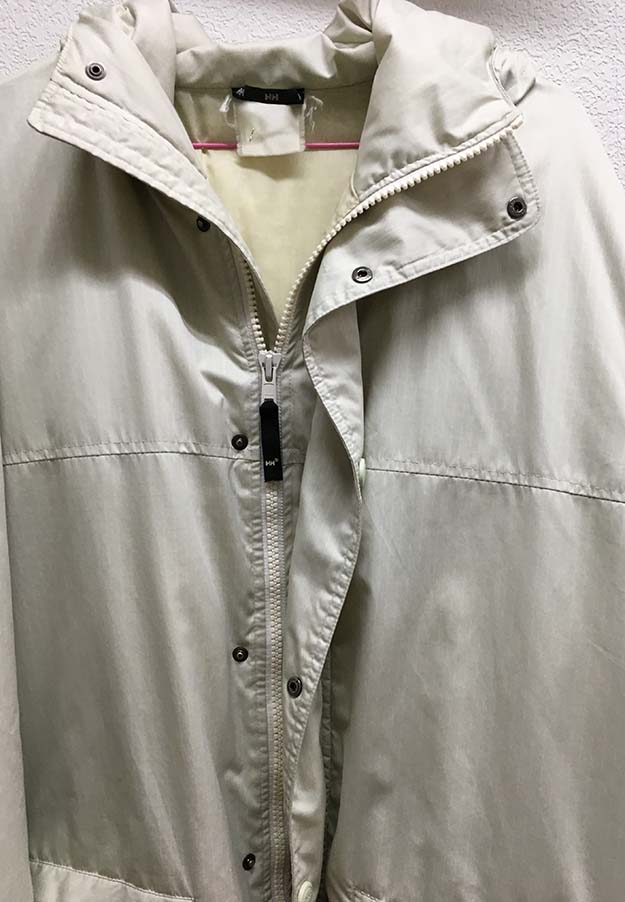 写真のコート、クリーニング後に「クリーニングに出す前にはこんな状態ではなかった」とクレームの付いた商品です。