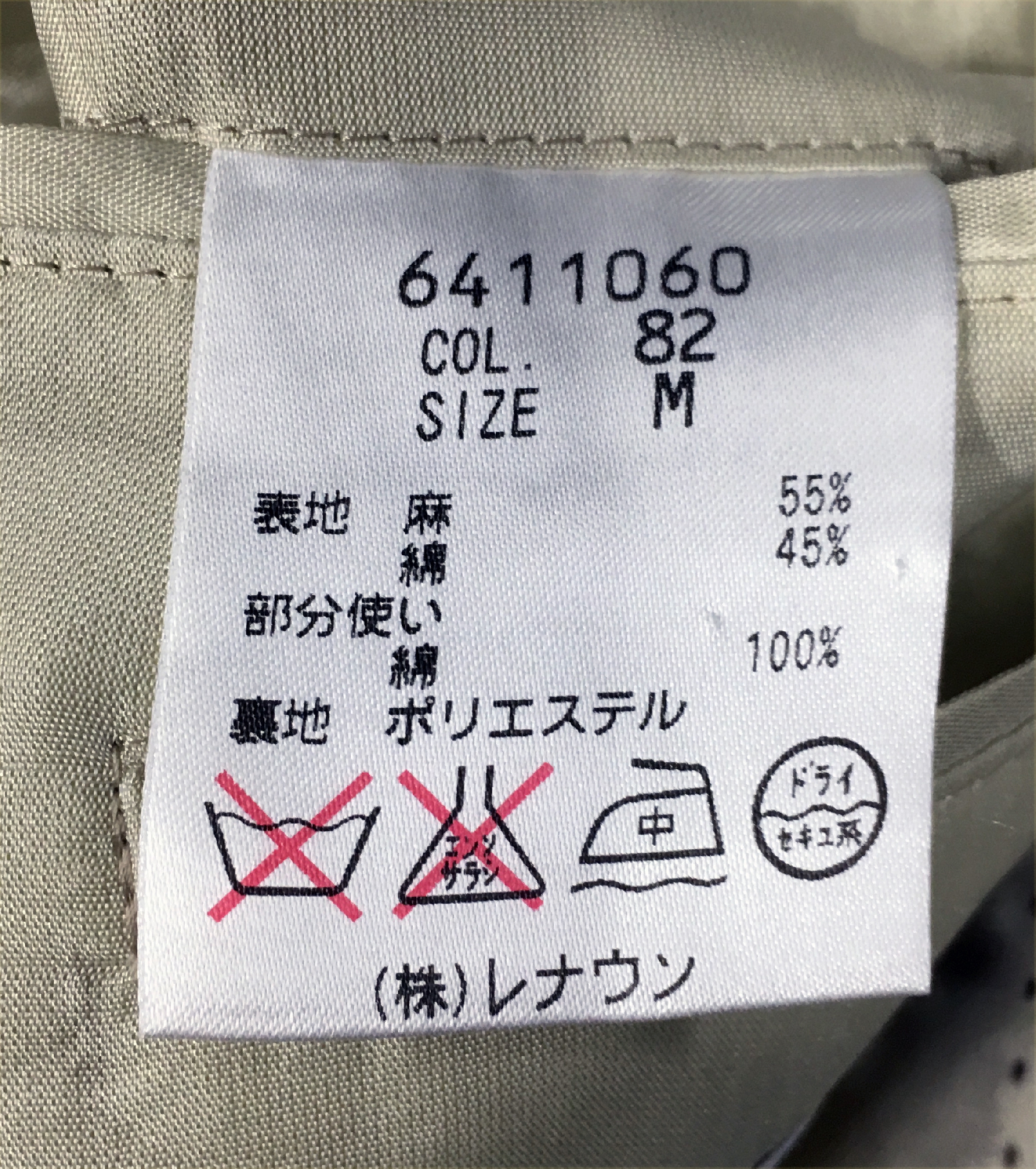 しかし、写真2-11の商品、出来ればランドリーまたはウエットクリーニング(可)の表示、ドライクリーニング(可)の表示が欲しいのです。何故ならば、生成りの商品ですので、長い間着用すると汚れが目立ってきます。この時ドライクリーニングだけでは汚れが取りきれないのです。こんな時の判断材料のためにも、せめてウエットクリーニング(可)の表示があってほしいのです。