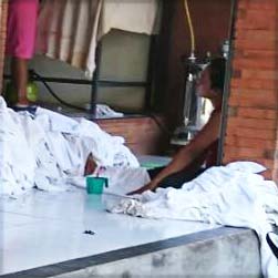 写真2-2、柱に寄りかかっている婦人が、写真2-3、の青いコップに入っている歯ブラシで、タオルに洗剤と思えるものをたたき付けていたそうです。