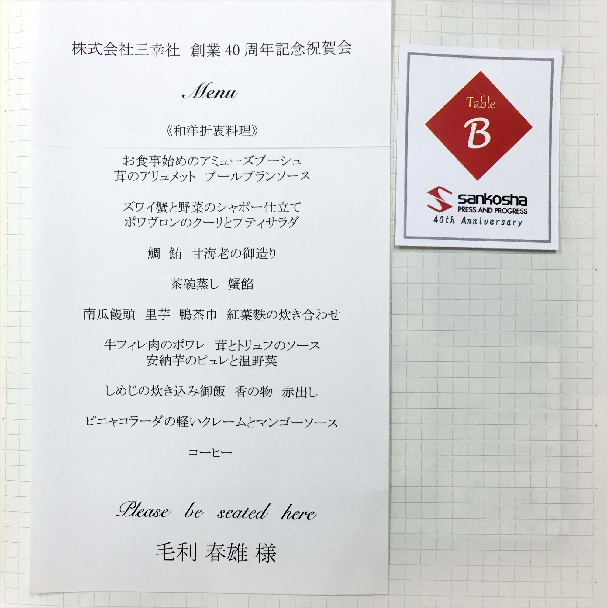 9月19日、京王プラザホテル多摩・白凰の間にて、株式会社 三幸社の創立40周年記念祝賀会が行われ、私も出席させていただきました。