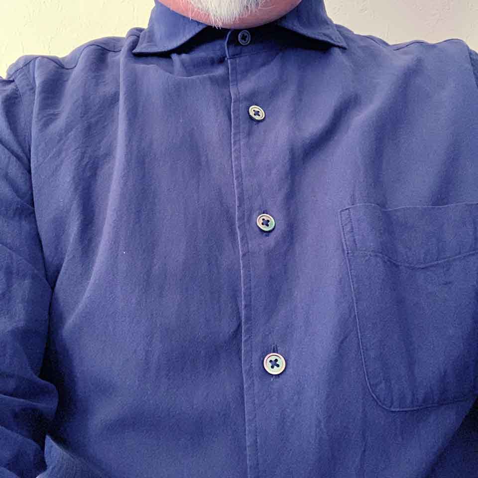 早速、着てみました。普通のシャツと違い「優しく包まれている」というような着心地です。着用後2日目のシャツの様子です。思わず統子に「触ってみて」と腕を突き出しました。第一声「わオ!」「これ綿よね?」でした。今治タオルと言うと「ふーん」という答えでした。