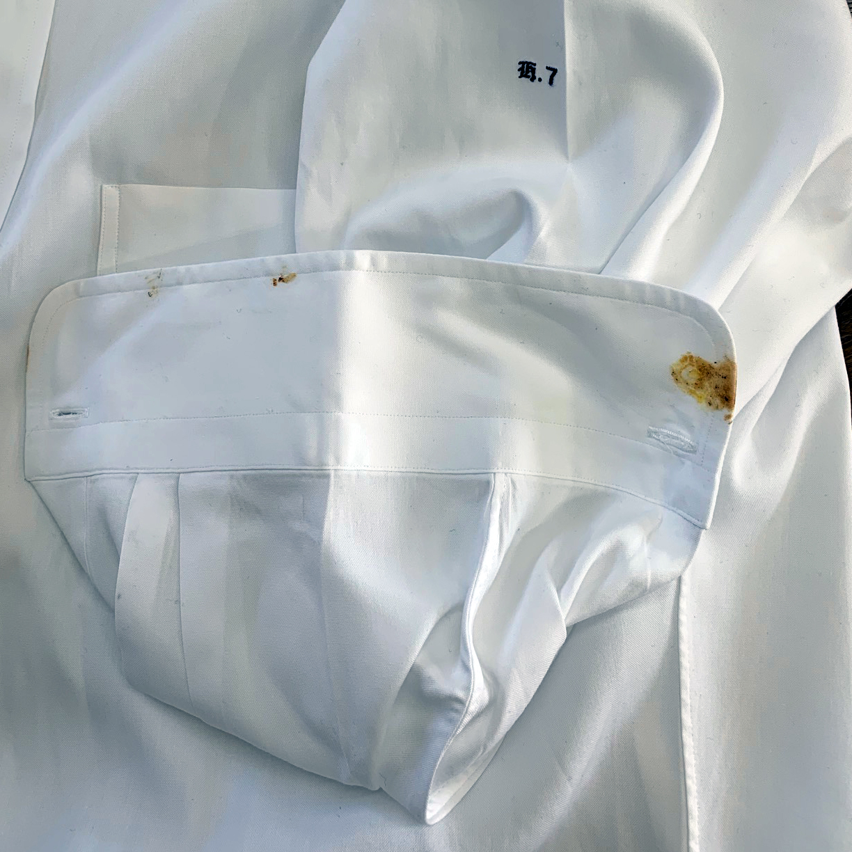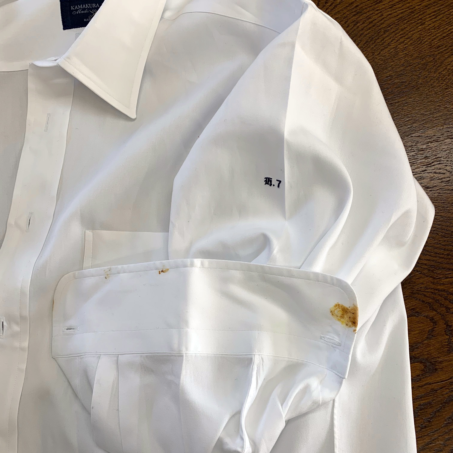 先日、カフスの横にべたっと醤油を付けてしまったワイシャツを、クリーニングに出しました。写真2-7。
