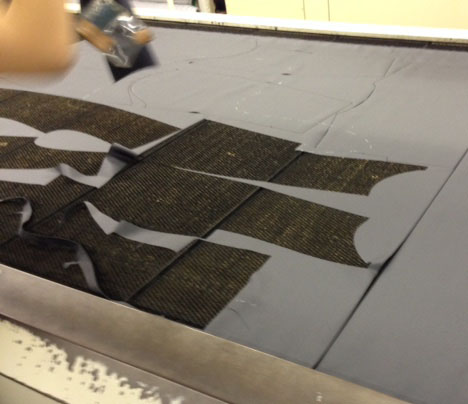 通常(平均的体型)のかたの裁断は、採寸に従って自動裁断機によって裁断されます。(写真1-8,1-9)
