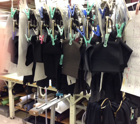 裁断された布片(各部)は、一着毎にクリップで留められます。これが、各部の縫製(部品作り)に周り、最終的に組み立て(服としての縫製)がされ、仕上げ工程に送られます。