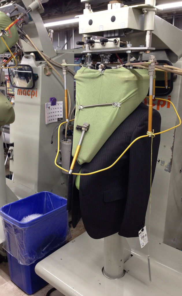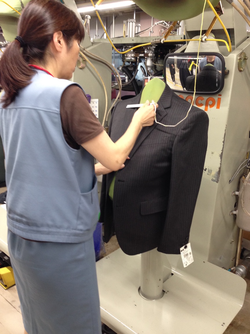 仕上げでは、生地に反発力があることもあってか、長い時間のプレスがされているように感じました。また、袖付け、肩、ラペルでは特に入念にチェックが行われていました。