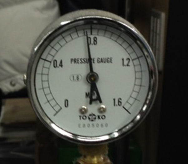 ワイシャツプレスの蒸気圧は多くの工場が〔0.75~0.8MPa〕(写真2-6~2-10)としています。しかし、圧力を上げると衿が縮むと蒸気圧を〔0.5~0.6MPa〕に設定されている工場があります。