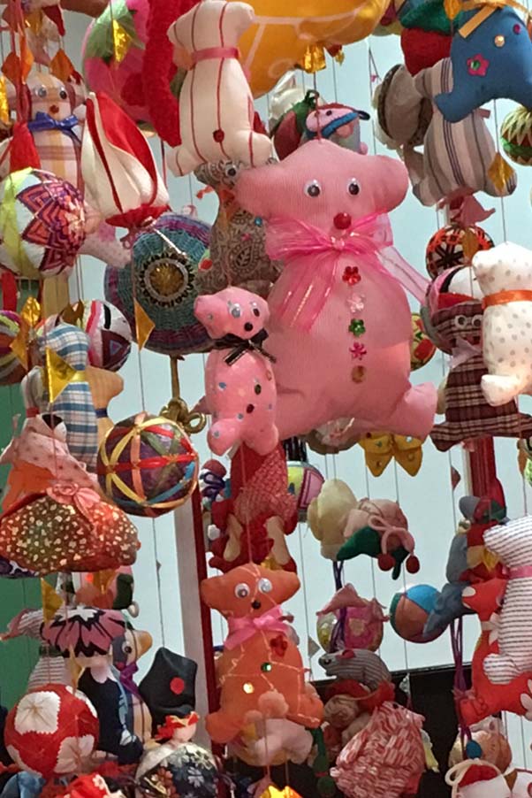 さげる順序は、上中段に飛ぶもの山のもの木になる(咲く)ものを、中下段に水中のも、動物、人形を基本としてます。最下段は這い人形、柳川まりとするそうです。